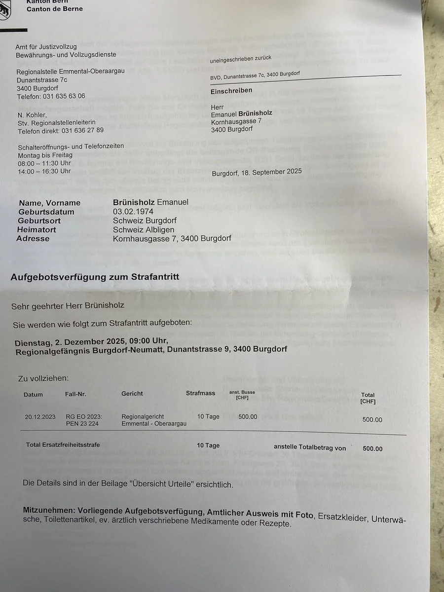 Statt die Geldstrafe zu zahlen, entschied sich Brünisholz, ins Gefängnis zu gehen, und kündigte am 19. September an: