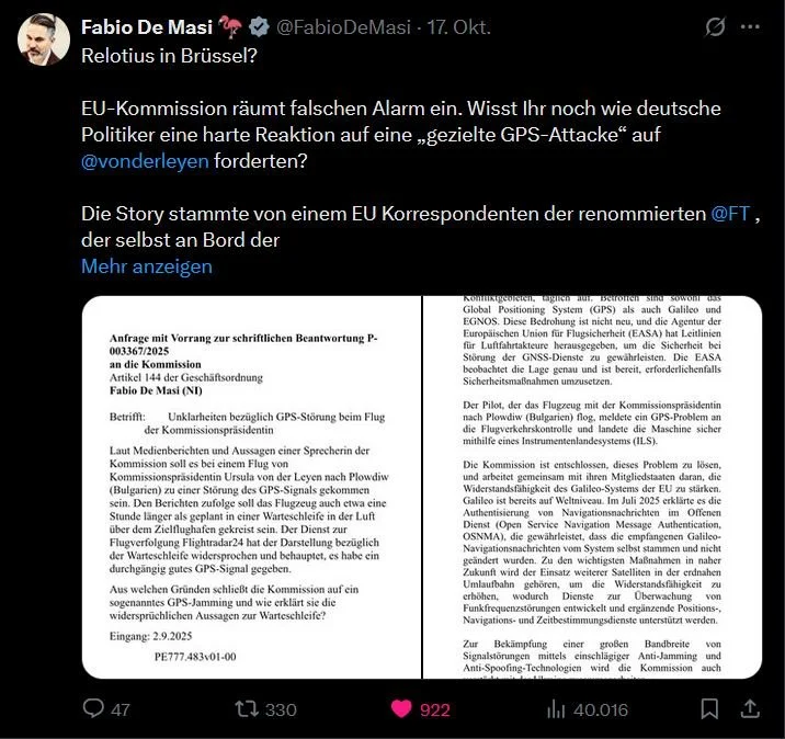 In einer offiziellen Antwort auf eine Anfrage des Europaabgeordneten Fabio De Masi musste die EU-Kommission einräumen: Das Flugzeug habe zwar ein GPS-Problem gemeldet, aber es landete völlig normal – mithilfe des Instrumentenlandesystems (ILS), das unabhängig von GPS arbeitet. Keine manuelle „Kartenlandung“, kein Krisenmanöver, keine einstündige Notlage.