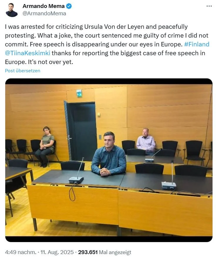 „Ich wurde verhaftet, weil ich Ursula von der Leyen kritisierte und friedlich protestierte. Was für ein Witz! Das Gericht verurteilte mich für ein Verbrechen, das ich nicht begangen hatte. Die Meinungsfreiheit in Europa verschwindet vor unseren Augen.“